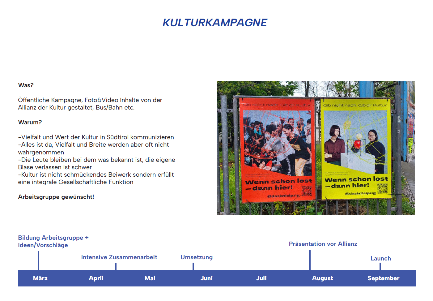 Die Allianz der Kultur will durch Öffentlichkeitsarbeit den Wert der Kultur in Südtirol stärken und die Vielfalt und Breite der Kulturinitiativen in der Region sichtbar machen. In diesem Zusammenhang werden wir eine landesweite Kampagne für die Kultur gestalten und umsetzen.